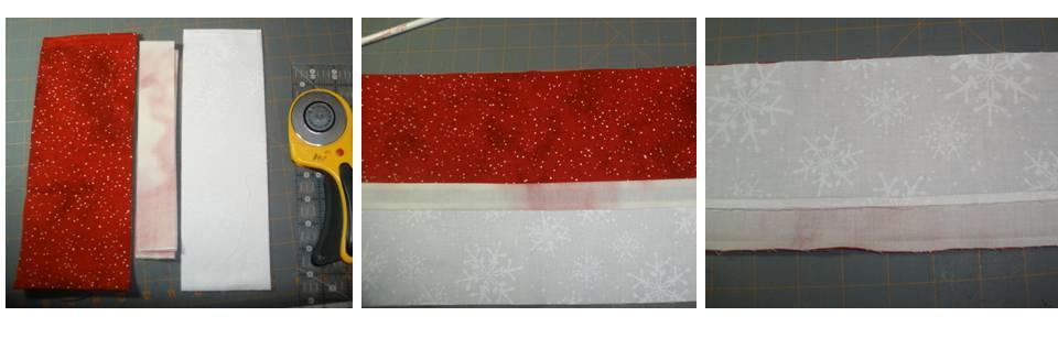 1. Start with 3 stripsthat you cut (see above) and join them together, LENGTHWISE, with 1/4" seam. Be sure to have a proper order of colors: RED-BEIGE/ROSY-WHITE (see photo). Press both seams towards the rosy (thin) strip - this will raise the strip a bit and look more like Santa's face. 2. Fold the strip set back so that the seam between red and rosy fabric is on the bottom (see photo on the right) - now you have it ready for cutting!